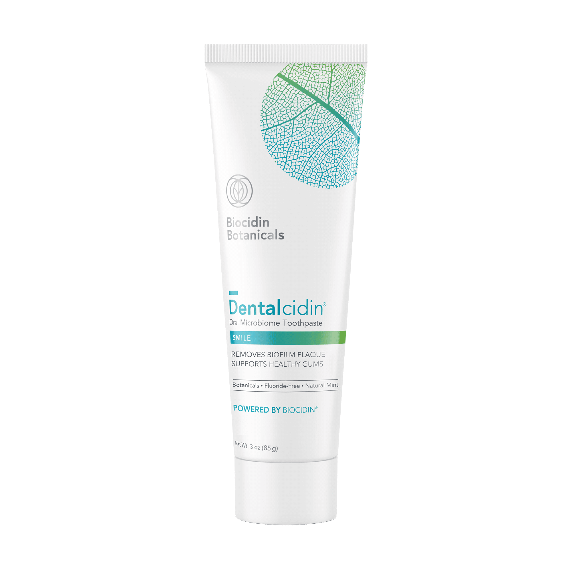 Dentalcidin toothpaste features the full Biocidin botanical blend for natural oral biofilm disruption. Fluoride-free, plant-based formula with peppermint, cinnamon, tea tree, and clove oils. Removes biofilm plaque, promotes healthy oral microbiome, freshens breath, and naturally whitens teeth.
