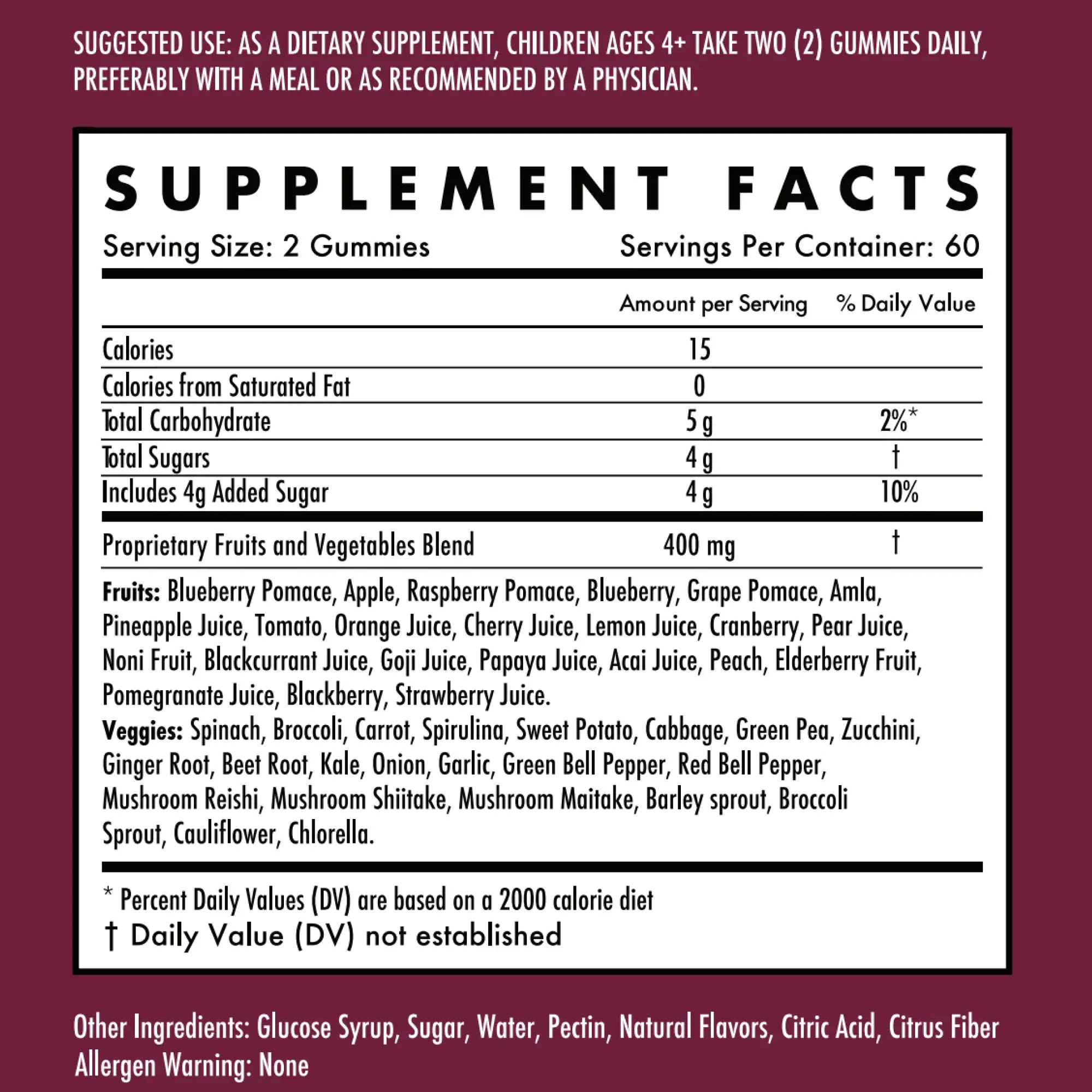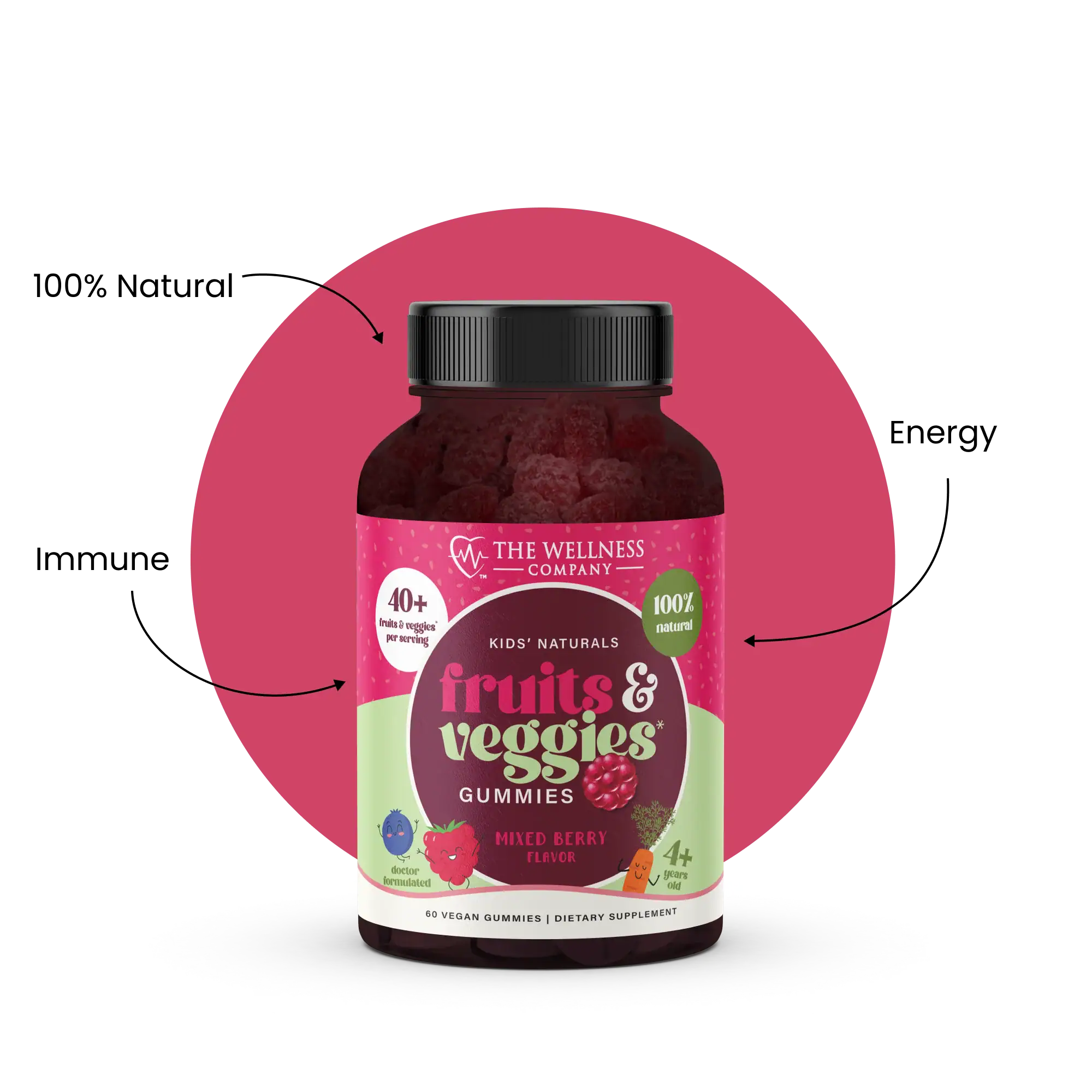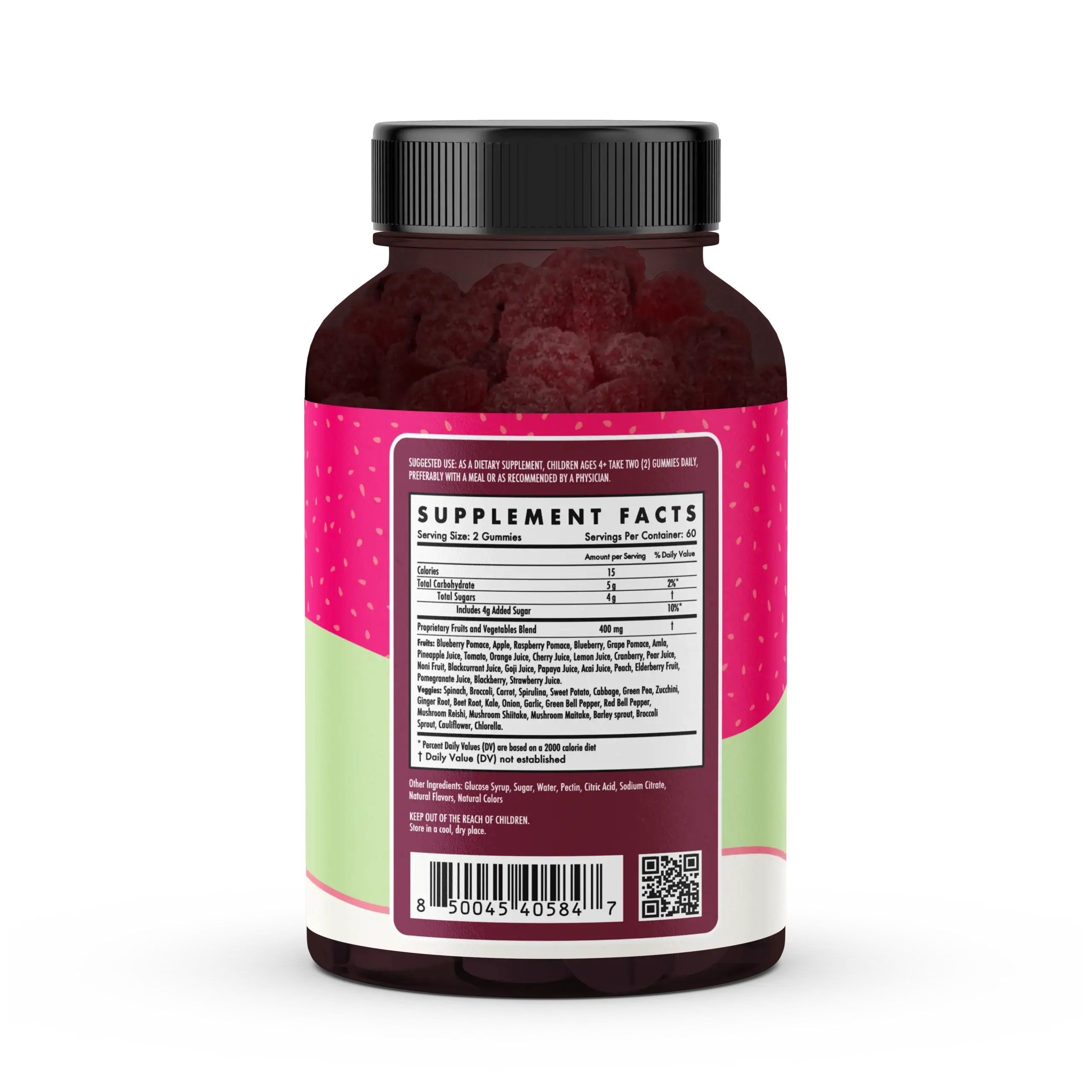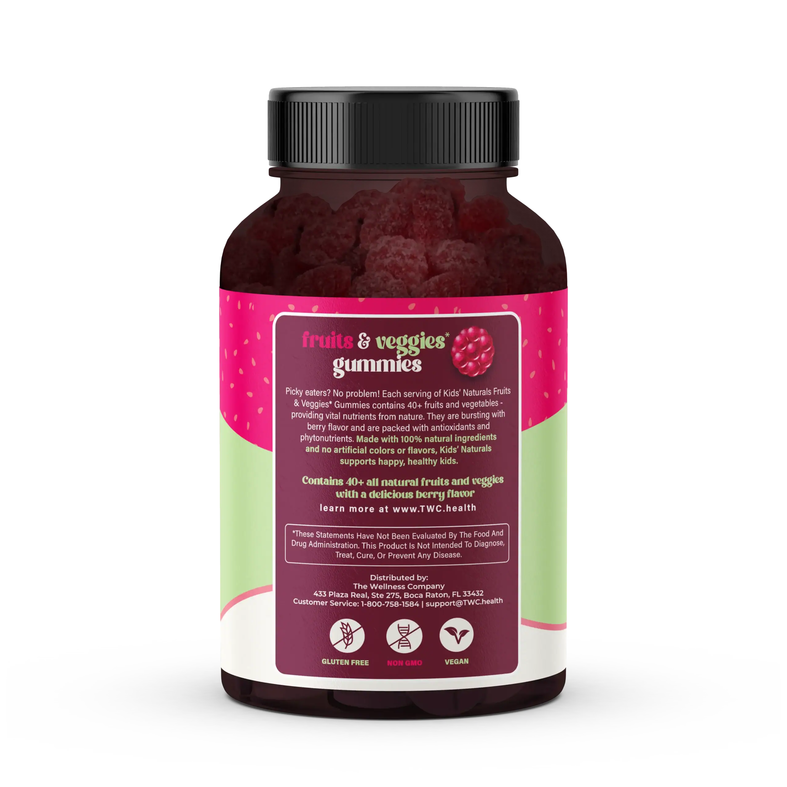 Fruit & Veggie Gummies are a whole-food-inspired supplement formulated to help children get the phytonutrients, antioxidants, and vitamins found naturally in a variety of fruits and vegetables โ especially important for picky eaters who may not consume adequate servings daily. Made in a delicious gummy format that kids actually enjoy, they provide concentrated plant-based nutrition in a convenient, mess-free form. They are designed to complement a healthy diet rather than replace whole foods.