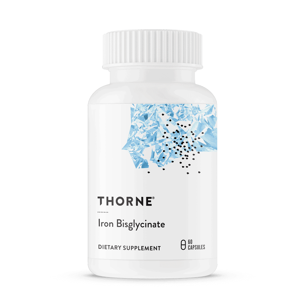 Iron Bisglycinate by Thorne delivers iron in the chelated bisglycinate form, which is significantly better absorbed than ferrous sulfate and notably gentler on the gastrointestinal tract, making it the preferred form for individuals who have experienced constipation, nausea, or stomach upset with standard iron supplements.