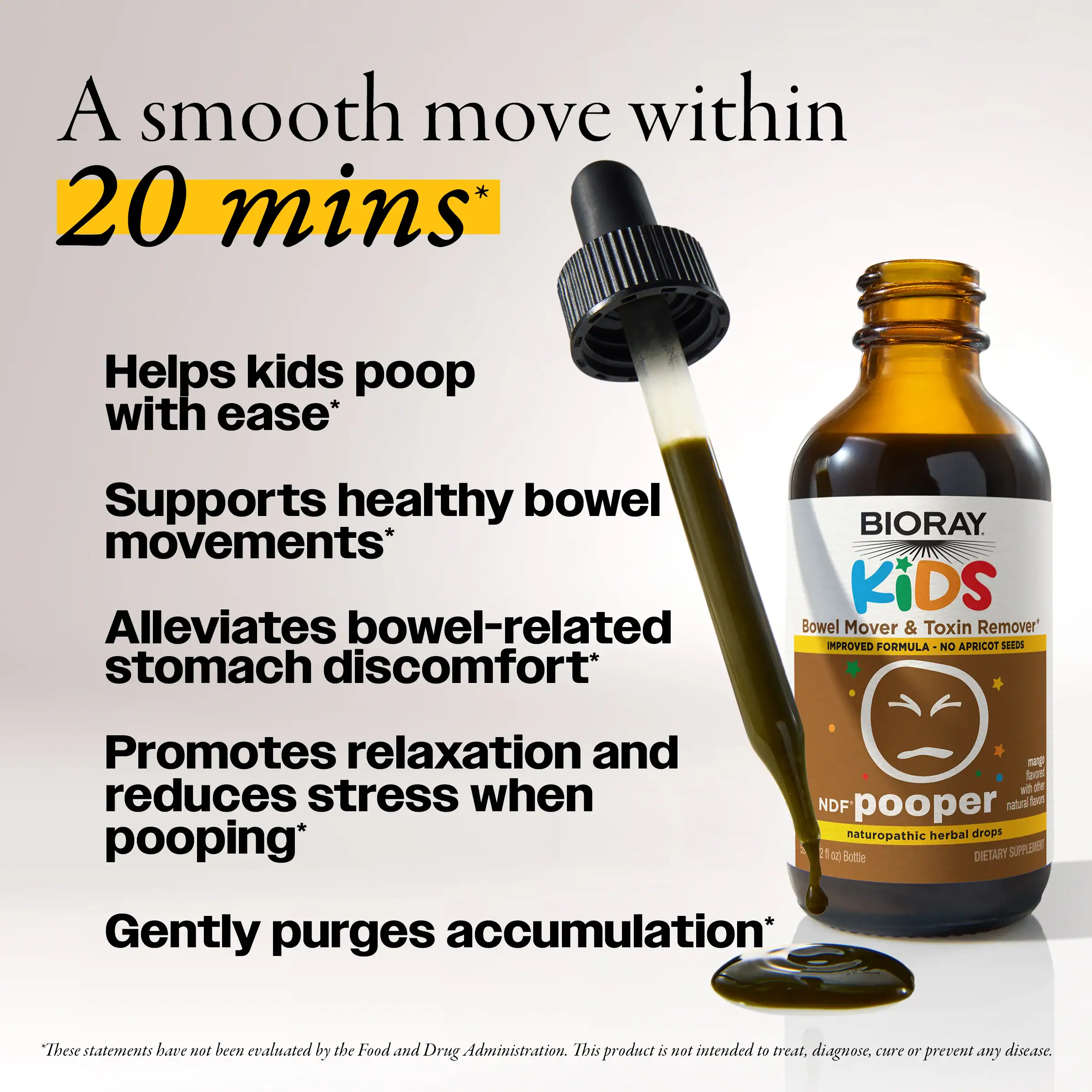 NDF Pooper by BioRay is a certified organic liquid herbal formula designed to gently support regular bowel movements and healthy digestive elimination in children and adults, combining bowel-tonifying botanicals with BioRay’s NDF gentle detox support for comprehensive digestive and elimination health.