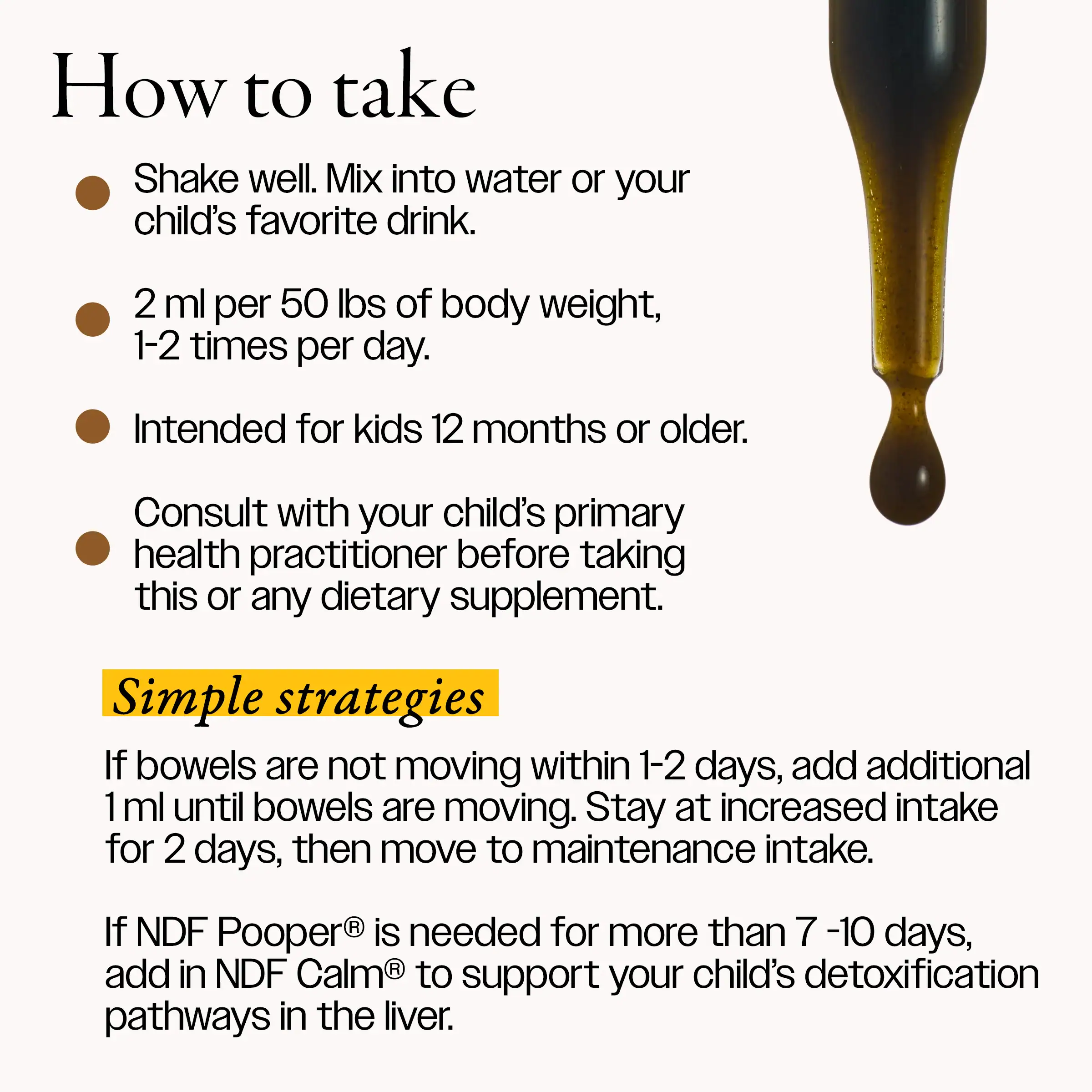 NDF Pooper is ideal for children and adults experiencing infrequent, difficult, or uncomfortable bowel movements, those in detox protocols where regular elimination is essential for toxin removal, and patients wanting a gentle, natural bowel support that does not create dependency or harsh urgency.