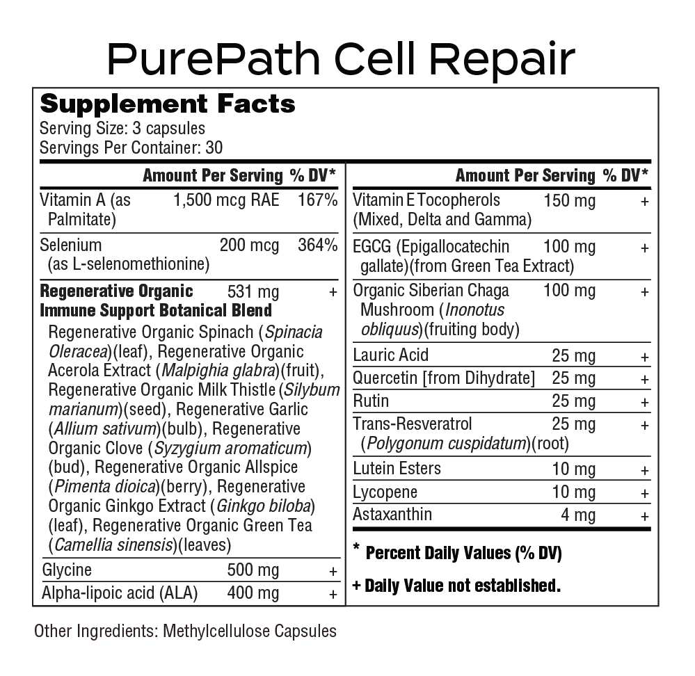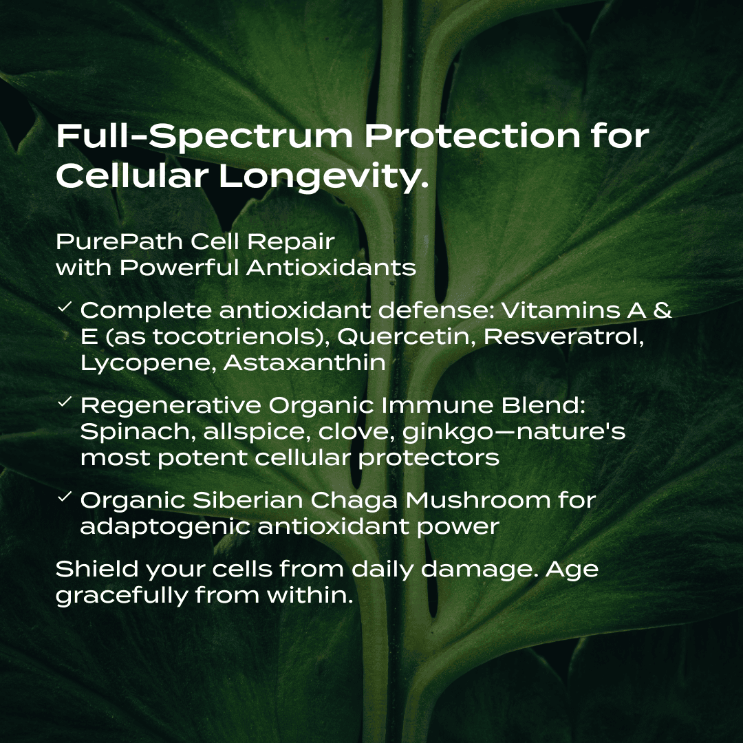 PurePath Cell Repair is a comprehensive antioxidant and cellular health formula designed to help the body neutralize free radicals, reduce oxidative stress, and support natural cellular repair and regeneration. The formula combines a full-spectrum antioxidant complex with a regenerative organic immune botanical blend — providing protection at the cellular level while simultaneously supporting immune resilience. In an era of environmental toxin exposure, chronic stress, and nutrient-depleted diets, targeted cellular protection has become a foundational component of any serious wellness protocol.*