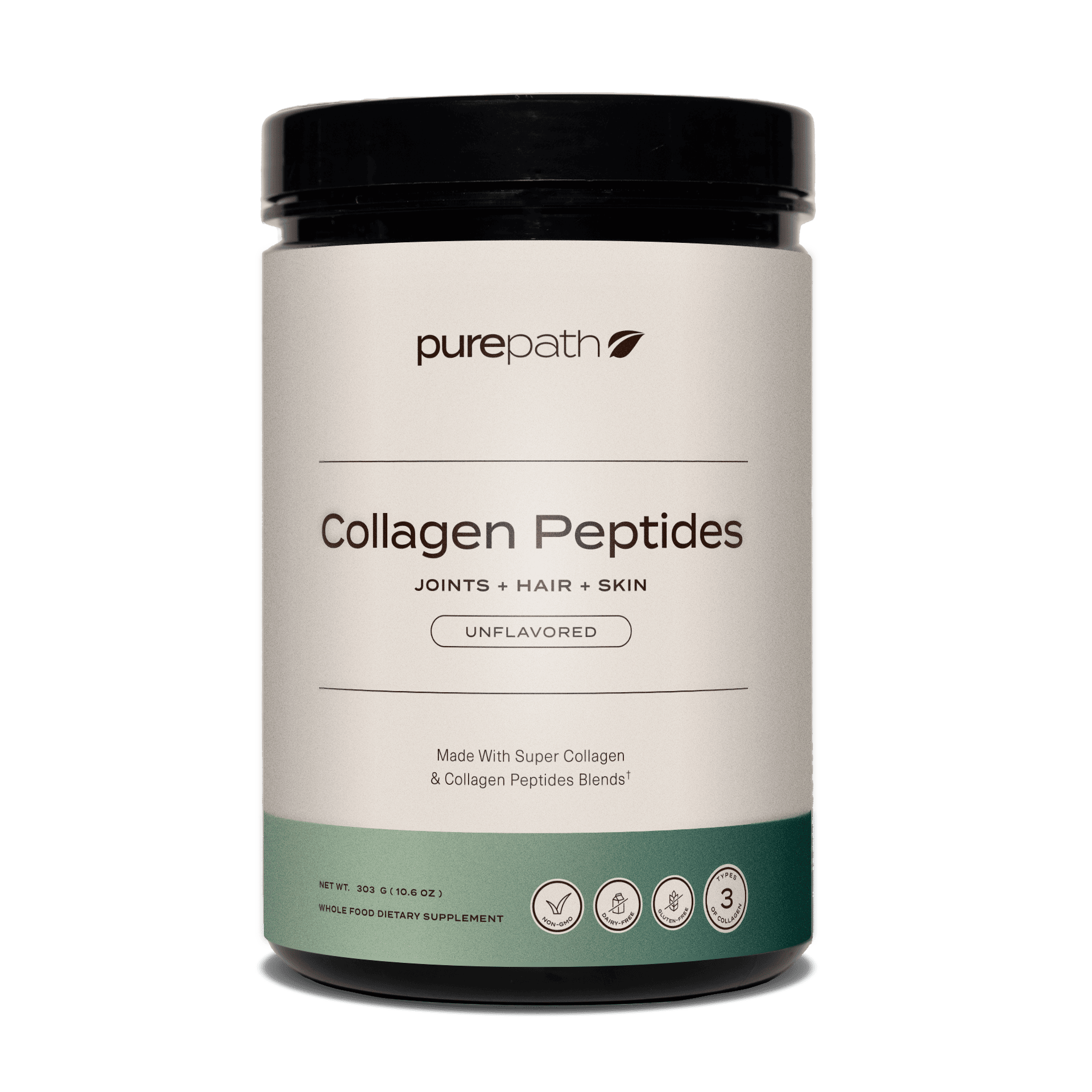 PurePath Collagen Peptides provides Types I, II, and III collagen from grass-fed, regenerative organic sources. Each serving delivers 9g of protein with the specific amino acids needed for joint, skin, hair, nail, bone, and gut lining support. Unflavored powder dissolves easily in any beverage.